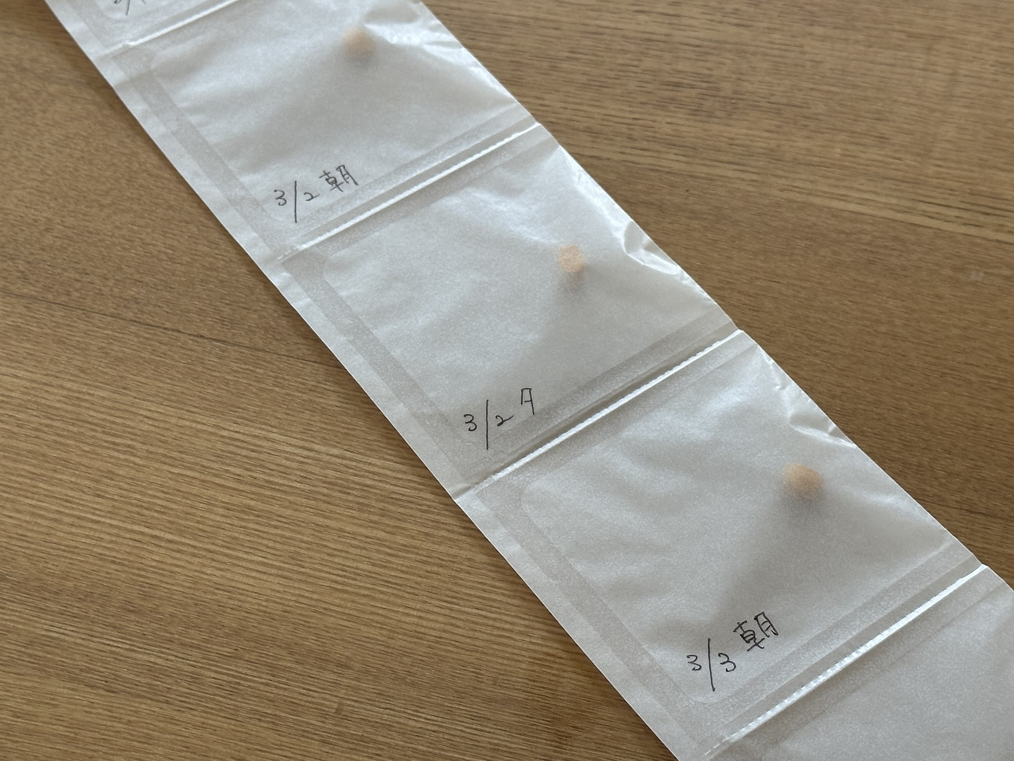 薬を処方された時には、毎回飲ませたか飲ませてないかと不安になったら困るので、必ず日付と朝夕を記入しています。小型犬なので薬は小さくカットされこのようなパックで出されます。